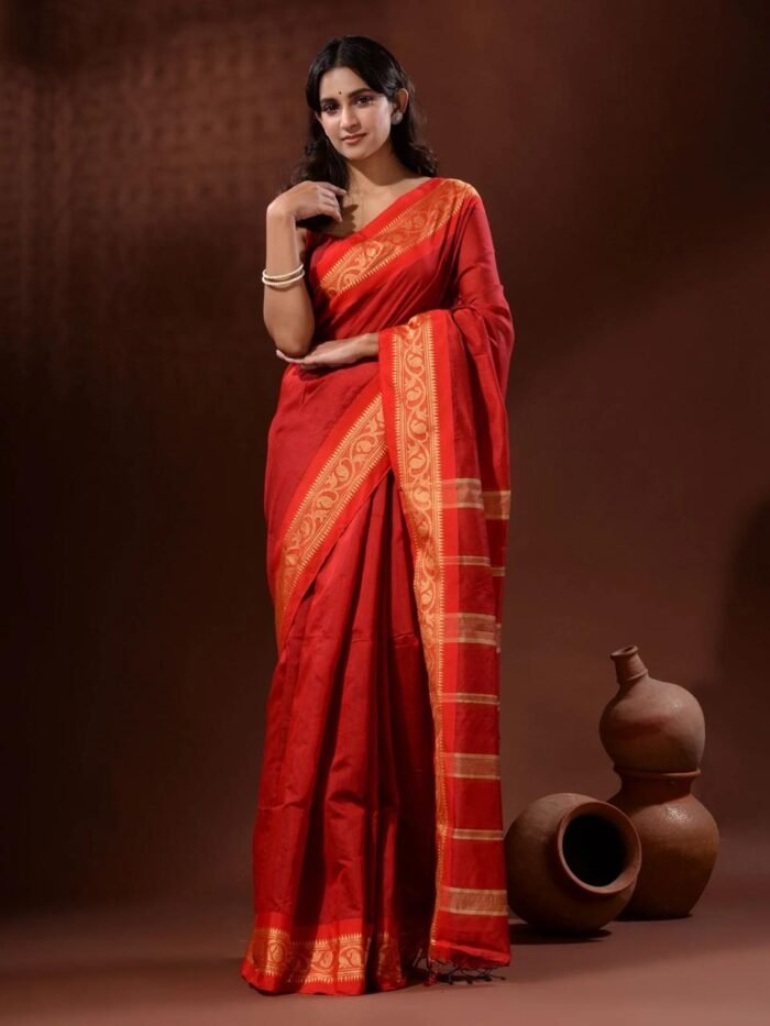 Imperial Red Shade Handloom Vumri Khadi Border Khadi Cotton Saree
