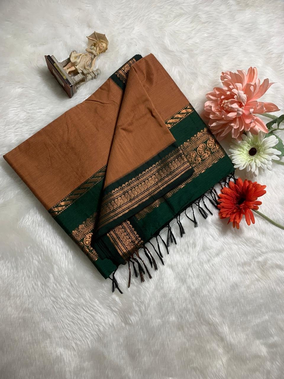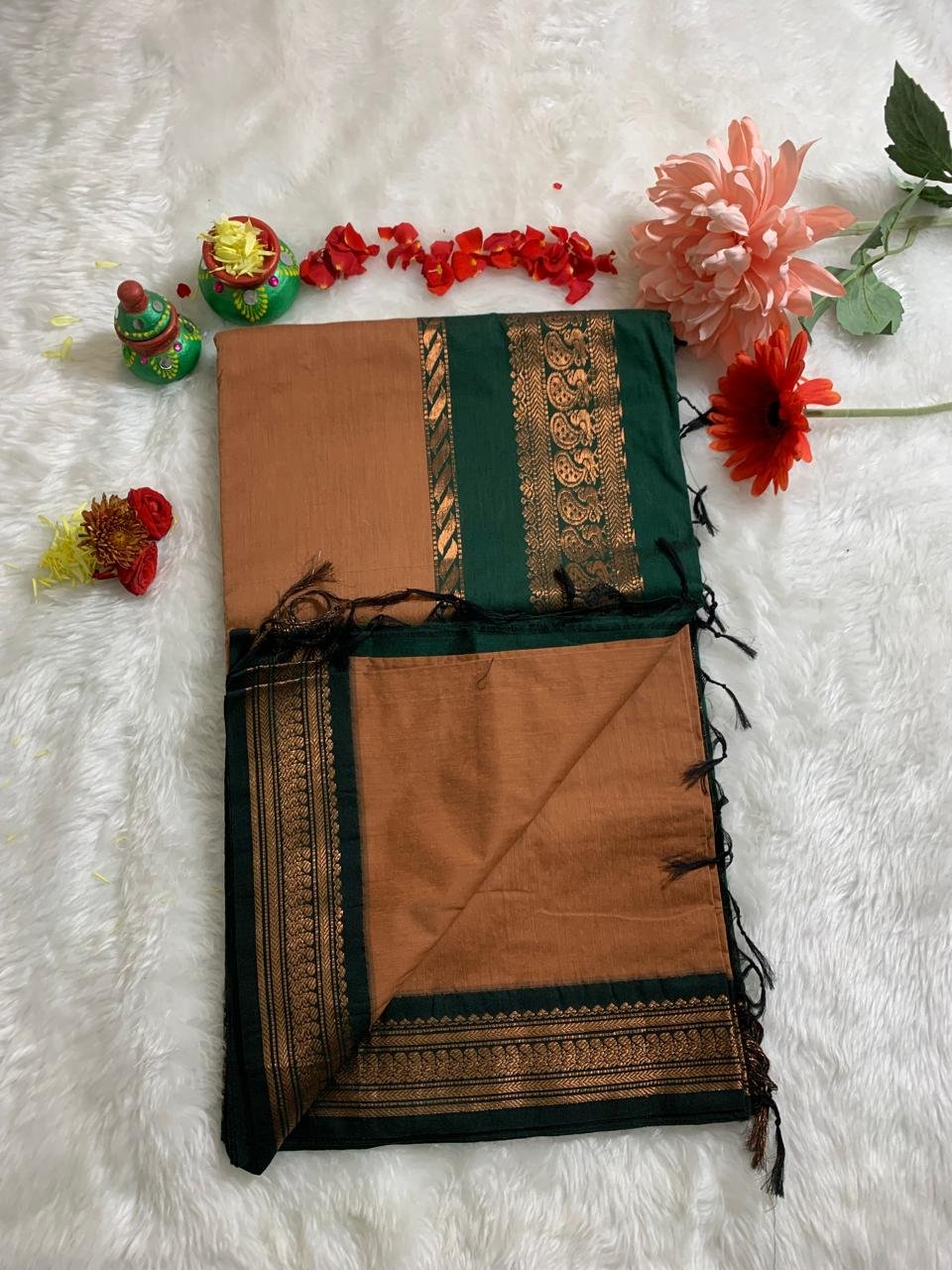 Smoldering Copper Premium Kalyani Cotton Silk Saree with Kaitoke Green Zari Border